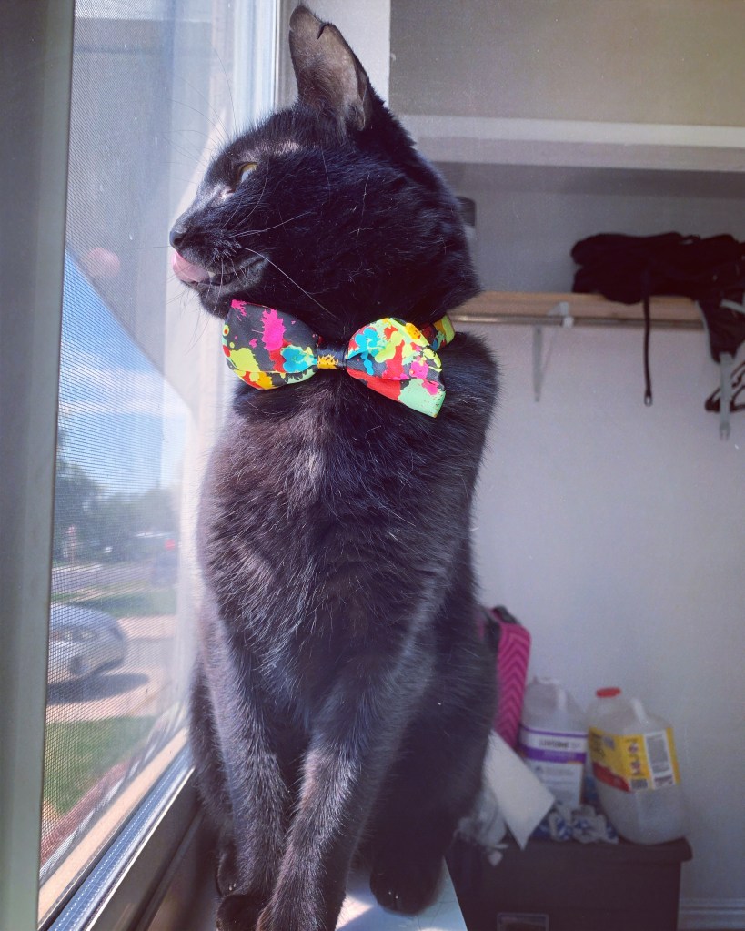 Ollie is my six year old cat. His personality is very spunky and honestly, like most cats, he will decide when he does or does not want love. He is not afraid to swat at you if he has had enough love. However, when he does want love he is so sweet and very cuddly! Also, doesn’t he look so good in bowties?