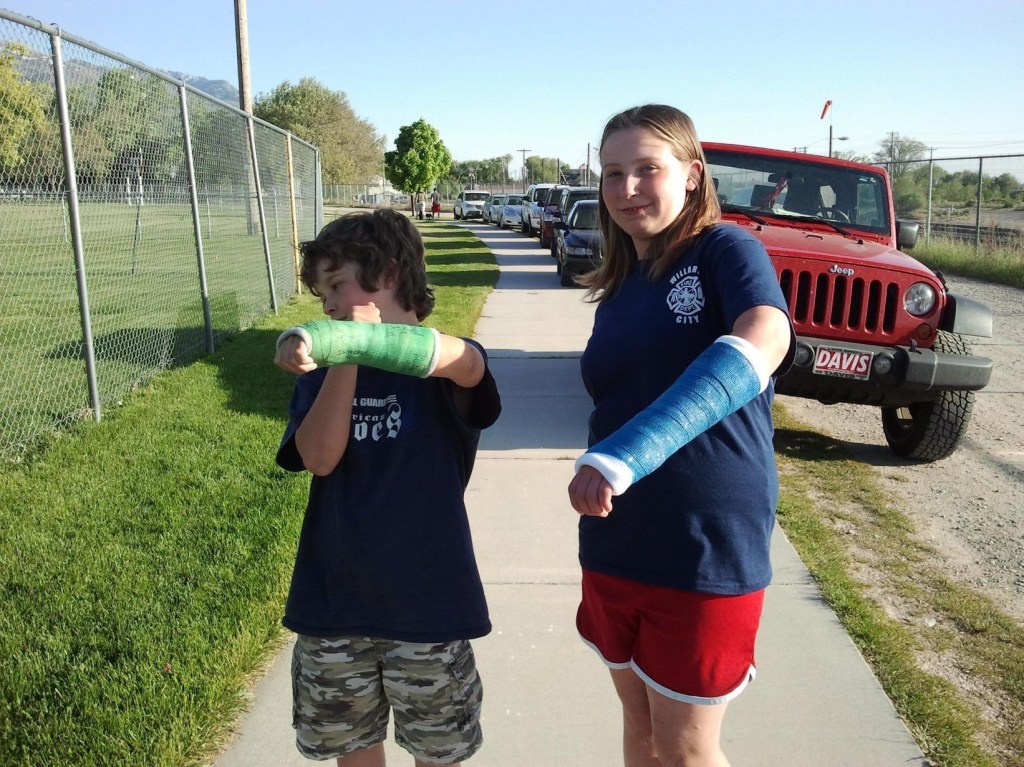Me and my brother are so close we even broke our wrists at the same time! He fell out of a tree and I played keeper in soccer and it snapped back when I blocked the ball. His cast was green with blue sparkles and mine was blue with green sparkles. See, so cute!
